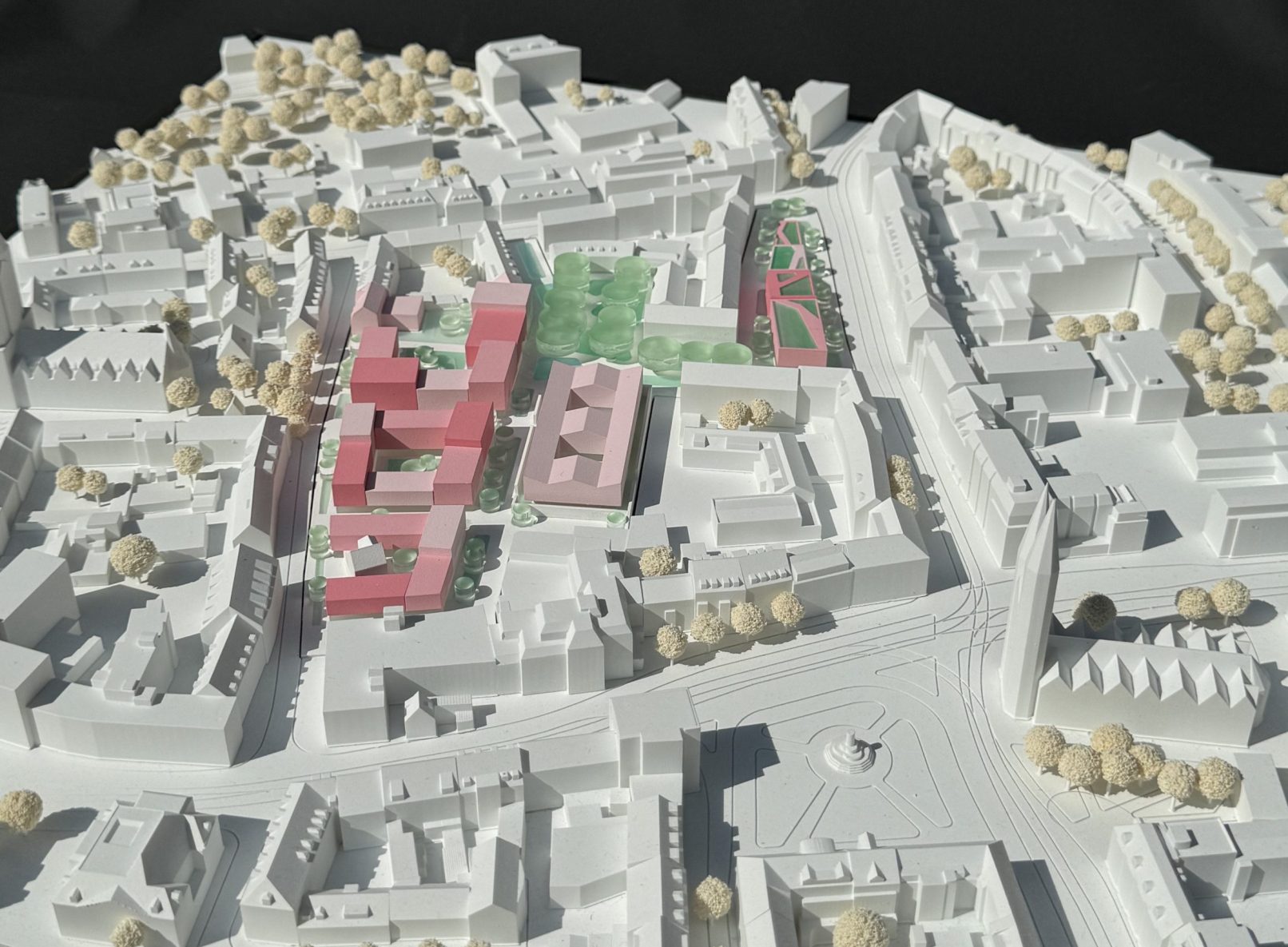 Der neu entstehende Pocket Park wird zum GalerieGarten. Er nimmt die kleinteiligen Strukturen und Atmosphären der GalerieHöfe auf und überträgt sie auf die unmittelbar angrenzende Freiraumsituation. Es entsteht ein grüner Freiraum, der die unterschiedlichsten Funktionen und Bedürfnisse des Quartiers bedient. Die einzelnen grünen Einheiten bilden differenzierte Räume, die den Platz für das Spielen und Toben, biodiverse Pflanzungen und ein Wasserspiel bereithalten. Die einzelnen Einheiten werden von langgestreckten Sitzelementen gesäumt und laden zum Verweilen unter den imposanten Bestandsplatanen ein. Zwischen den einzelnen Grünelementen ergeben sich platzartige Aufweitungen, die dem FamilienForum und den GalerieHöfen zugeordnet werden können. Hier ist Raum für Außengastronomie, Aufenthalt und kleine Veranstaltungen. Als Erweiterung der GalerieHöfe dient der GalerieGarten ebenso als Ausstellungsort im Freien und kann Kunstobjekte oder Skulpturen temporär oder dauerhaft aufnehmen. Die Innenhöfe der einzelnen Stadtblöcke werden als gemeinschaftliche Freiräume ausgestaltet. Lediglich der südlichste Hof erhält durch die öffentlichkeitswirksame Kemenate öffentlich zugängliche Aufenthaltsflächen. Die Straßenräume im Quartier werden möglichst grün gestaltet. Ein großzügiger, mittig gelegener entsiegelter Streifen bietet Platz für üppige Pflanzflächen, Sitzgelegenheiten sowie Abstellmöglichkeiten für Fahrräder. Im Öffentlichen Raum können so bis zu 360 Räder untergebracht werden. Lediglich die notwendigen Erschließungszonen für die Gebäude, Knotenpunkte sowie Flächen für Rettungsfahrzeuge werden mit hellen Betonsteinpflaster ausgeführt. In Nord-Südrichtung werden die mittig geführten Grüninseln zusätzlich mit einer Wasserrinne aus Cortenstahl gestaltet, welche an den heute verrohrten Burgmühlengraben erinnert. Die neu entstehenden Grünflächen im öffentlichen Raum nehmen Regenwasser auf und halten es zurück, bis es versickern kann. Sie fungieren damit als wichtiger Bestandteil des Regenwassermanagements und mindern die Gefährdung von Überschwemmungen erheblich. Im Bereich des GalerieGartens wird die Wasserrinne zum Wasserspiel. Die großflächig anlegten Grünflächen sowie die Wasserelemente beeinflussen das Mikroklima im gesamten Quartier des Großen Hofs positiv und wirken den Hitzeinseleffekten der innerstädtischen Lage entgegen.